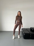 Комплект в рубчик Кроп топ із довгим рукавом та легінси із Пуш ап в кольорі мокко