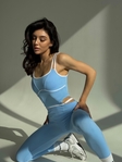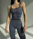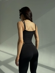 Пояс оформлений у вигляді бретелі, що дозволяє легко регулювати охоплення талії. Виріб пошитий з біфлексу, якісного та еластичного матеріалу. Біфлекс не линяє, стійкий до численних прань, приємний до тіла і не просвічується під час присідань. Комбінезон має кишені для чашок вкладишів. Самі чашки у комплекті не йдуть.